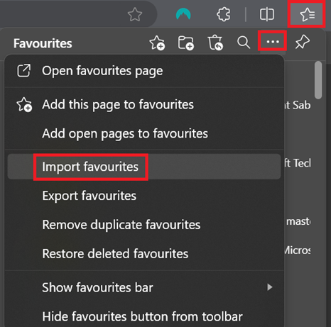 1. Open Edge, press Ctrl+Shift+O (or the Favourite icon directly), followed by the three dots, then 'Import favourites'